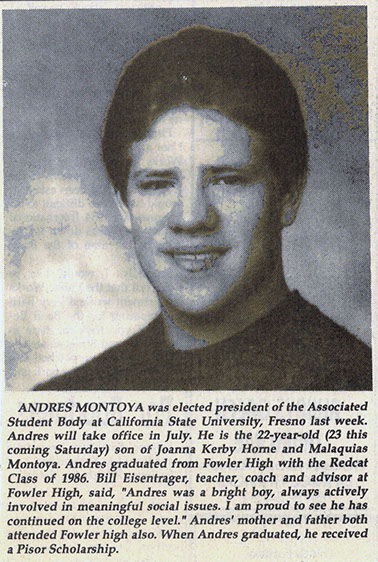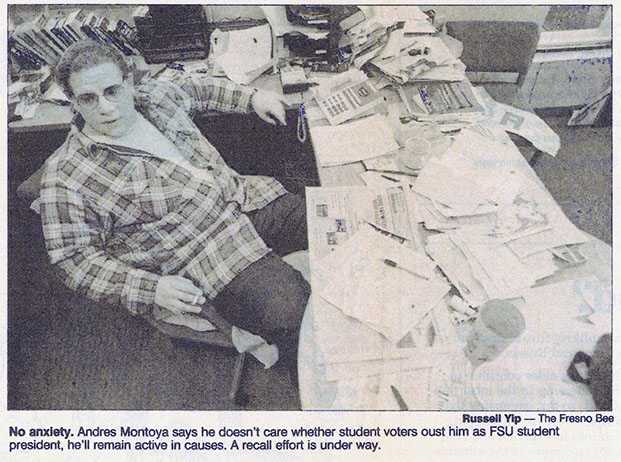 A committed political activist, Montoya didn’t shy away from confrontation or controversy. As student-body president at Fresno State, he fought against tuition hikes and was a forceful advocate for underrepresented groups. In 1991, after he defended a sign at a Columbus Day rally that said “go home whitey,” a recall effort was held to remove him from office that ultimately failed. Articles on Montoya's student activism can be viewed here. He continued his political involvement as a graduate student at the University of Oregon where he was a frequent critic of multiculturalism, believing that the token inclusion of minorities merely served as a cover up for larger structural ills. Some of these views are reflected in his essay, “Multiculturalism, El Movimiento and What Is To Be Done,” published as a small-run pamphlet by Sufre Publications. Later, as an instructor at Chabot College, he led a student walkout in protest of California's Prop 209 and was alleged to have knocked over a police motorcycle. Following this incident, his teaching contract wasn't renewed.